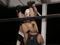 セブンと石井がリングに戻る。ロープワークからタックル合戦。一宮と高智にタッチ。ゴージャスは場外でMAYAと口ゲンカ(右写真)。