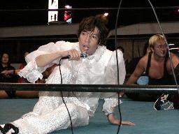 リングサイドに戻ってきたゴージャス、マイクを取ると「一宮コノヤロー!浅野!社長出て来い!」と浅野社長に八つ当たり?マイク(右写真)。
