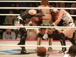 大向サッカーボールキック、石川立ち上がって大向に顔面キック連発(右写真)、大向受け切ってトラースキック一発で返す。大向コーナーに上る、東城も入ってダブルのヘアホイップで引きずり落とす。石川投げっぱなしのダブルアームフェースバスター、東城にタッチ。