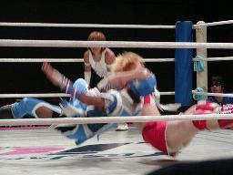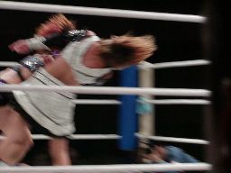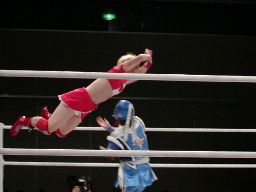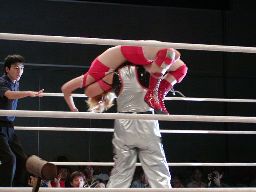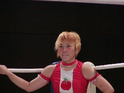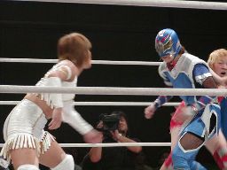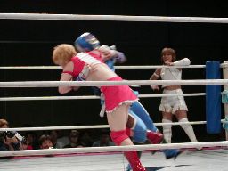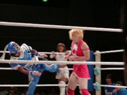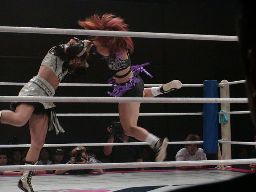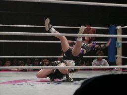 アップルミサイルキック、乱丸かわす。乱丸ハイキック、アップルかわす。乱丸フェイント入れてハイキック(左写真)。さらに延髄蹴り、カバー、カウント2。