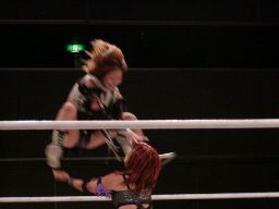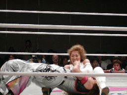 武藤がJYAGIEをエプロンに押さえ込む、乱丸コーナーに上ってダイビングニールキック(右写真)、今度はカウント3。
