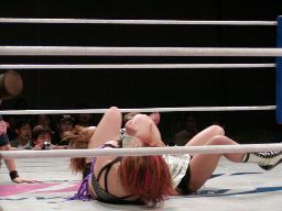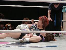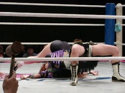 乱丸ロープに振る、アップル切り返してSTO(右写真)。アップルコーナーに上る、武藤がリングに落とす。