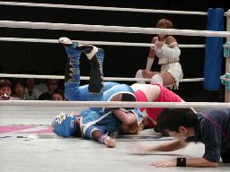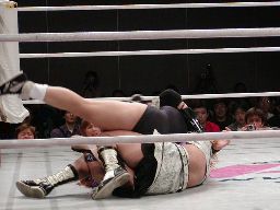 JYAGIEコーナーに振る、武藤切り返す、JYAGIEコーナーに上って反転ミサイルキック、武藤スカす。武藤ロープに振ってケサ切りチョップ、JYAGIEかわして飛びつき十字固め、ちょっと崩れるが強引に十字に(左写真)、武藤ロープ。JYAGIEロープに飛ぶ、武藤キャッチしてボディスラム、カバー、カウント1。JYAGIEブリッジで立ち上がってアップルにタッチ。5分経過。