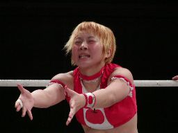 乱丸トラースキック、武藤かわづ落とし、乱丸カバー、カウント2。乱丸ロープに飛ぶ、JYAGIE足引っ張る。アップル首固め、カウント2。アップルバック取るとジャーマン(右写真)、カウント2。