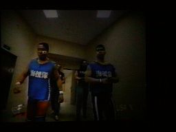 1入って2とダブルチョップ(左写真)。エルボードロップ連打。2がコーナーで羽交い絞めにして1が逆水平。首投げからストンピング。ネックブリーカードロップ。ロープに振ってエルボーで倒すと片羽絞め、3がカット。1と2がダブルのネックブリーカー、1スリーパー、3カット。5分経過。書いててなんか空しいな。1とか2とか3とか5とか。