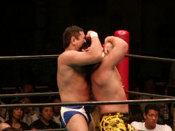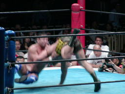 健介先に立って逆水平、コーナーに振るがフェースクラッシャーは永田食わない。永田ハイキック(左写真)、健介ダウン。