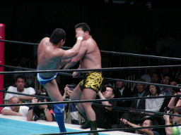 王者・永田(右写真)。しかしセコンドが垣原一人というのはどういうこと?一方の健介にはブルー・ウルフ、健想、棚橋が(それもどうかと思うが)。