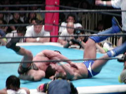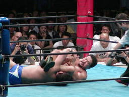 健介パンチからいきなりのノーザンライトボム(左写真)、永田場外へエスケープ。永田間を取ってリングに戻る。健介がミドルキック連打、永田ダウン。カウントは8まで進む。健介ロープに振って逆一本背負い、カウント2。