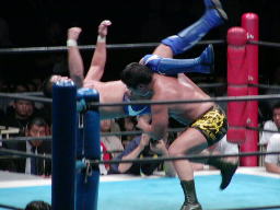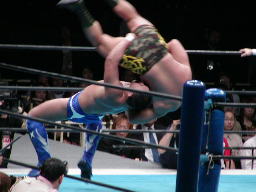 健介パンチ、ラリアット、トルネードボム(右写真)、カウント2。健介ロープに飛んでラリアット、永田はハイキック、両者ダウン。