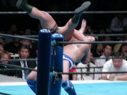 健介場外エスケープ、永田追いかけてキック。先にリングに上がろうとするところに健介が足へのラリアット(右写真)。