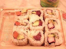 13時半にグランド・セントラル・ステーションまで戻り、地下のダイニング・コリドーで「いかにもアメリカちっくな」寿司の詰め合わせ(カリフォルニアロール他)を食べる(右写真)。結構うまい。