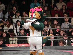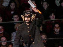 いろんな音楽がかかるんだが、闘龍門初めてなんで、どれが「Opening Theme」かわからん。そうこうするうちウルティがリングに(右写真)。ウルティモ・ドラゴンの復帰とともにウルティも闘龍門JAPANのリングに戻ってきたらしい。菊池リングアナがカードを発表しようとするとそこにウルティモ・ドラゴンが入ってくる。