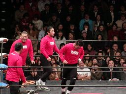 八木コーナーに上ってダイビングヘッドバット(左写真)からヒレ折り固め、新井ロープ。