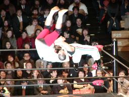ゲレーロスはダブルのカニばさみでキッドの顔をロープから出すと2人で場外に降りて顔の両側からサンドイッチドロップキック(右写真)。キッドを客席に投げ込む。さらに三島も2人でリフトアップして客席に。