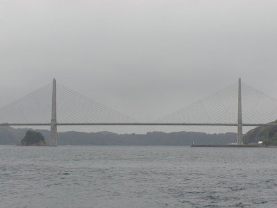 地下鉄−筑肥線で唐津に。唐津駅前から呼子行きのバスに乗り、フェリー乗り場(壱岐へのフェリーが出ている)まで。港からは呼子大橋(右写真)が見える。