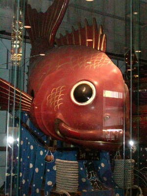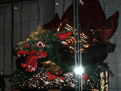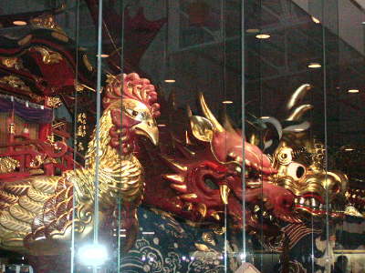 いちばん有名な「鯛」の曳山(右写真)。「魚屋町」だから鯛なのだそうだ。(わかりやすい)どの曳山も19世紀の作とのこと。