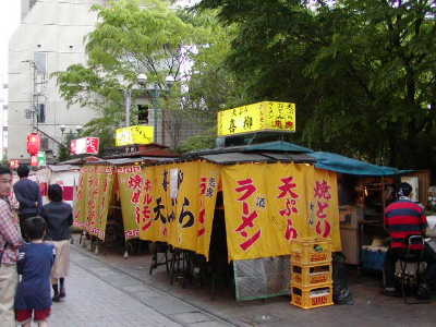 夕飯は三越裏の屋台街(三越と警固公園の間に6つくらい並んでいる)にある「喜柳」に(右写真の右端)。ここは学生時代よく行っていた屋台。もちろん15年くらい経ってるので主人も変わっているが、こちらは味(と値段の安さ)を忠実に受け継いでいる感じ。いい気持ちで飲み食い。天ぷら盛り合わせ、ビール、酒2杯、おでん4種、焼き物2種、ラーメンで3400円。ちゃんとしたところは普通の値段なのよね。