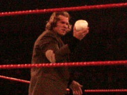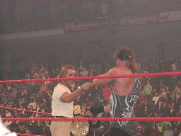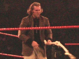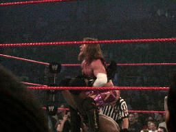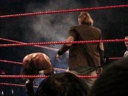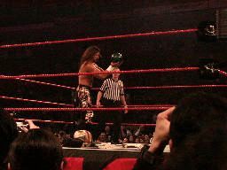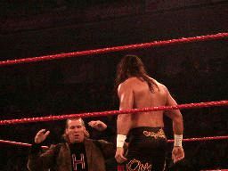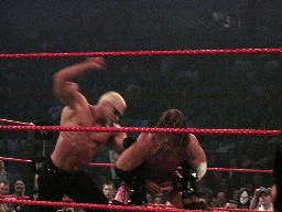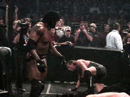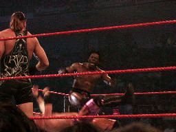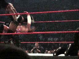 立てないRVDを尻目にブッカーとジェリコがパンチの打ち合い(左写真)。ブッカーコーナーに振る、ジェリコ切り返す、ブッカー逆水平、パンチ、コーナーで踏みつけ。