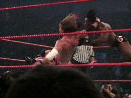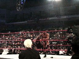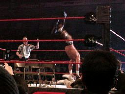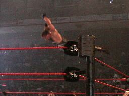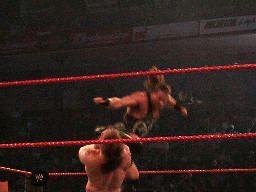 RVDコーナーからジェリコにダイビングラリアット(右写真)、カウント2。ジェリココーナーに詰めて逆水平連打、対角線コーナーに振る、RVD切り返してモンキーフリップ、カウント2。コーナーで踏みつけ。RVDロープに振ってラリアット、ジェリコかわす。RVD水面蹴り、ジェリコこれもかわして延髄蹴り、カウント2。