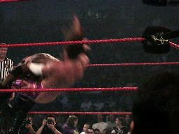 ジェリコを場外に落とすと共闘体制は崩れRVDとブッカーの1vs1に。RVDウラカン・ラナ(左写真)、側転からのムーンサルト、カウント2。ロープに振る、ブッカー切り返してサイドウォークスラム。ラリアット、カウント2。ジェリコがリングに戻りブッカーにパンチ。RVDがベルトで攻撃、ジェリコかわしてブッカーにヒット。ジェリコカバー、カウント2。ブッカー戦線離脱。