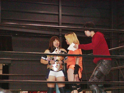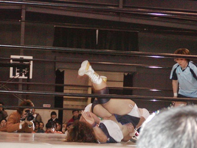 ASARIとコマンドは日向と渡辺の両手両足を絡ませて固める(右写真)。レフェリーがブレーク。