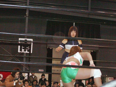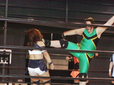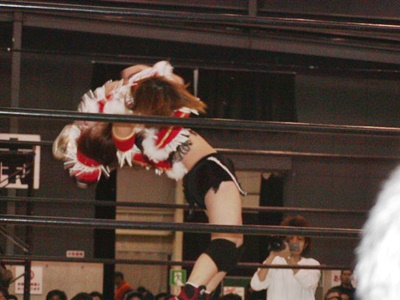 ASARIロープに振ってジャンピングニーアタック、カウント2。コーナーに振ってロンダートカンガルーキック(右写真)。対角線コーナーに振る、日向切り返し串刺しニーアタック、DDT。渡辺にタッチ。