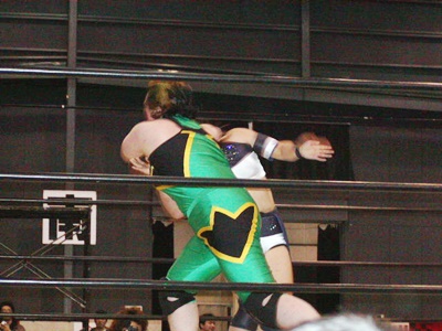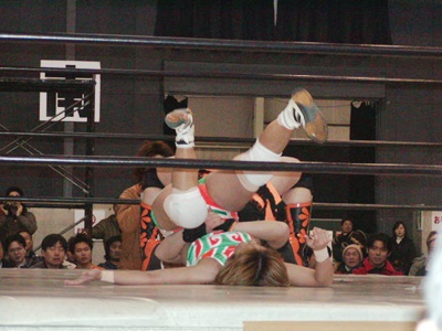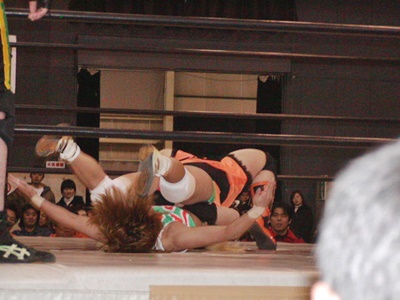 コマンドジャーマン、日向着地して逆にロコモーションジャーマン(右写真)、カウント2。日向コーナーに上って延髄ニー、コマンドかわすが日向は駆使刺しニーアタック。コマンド回転エビ固め、掌底、日向かわしてジャーマン、カウント2。日向は渡辺にタッチ。15分経過。