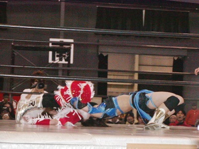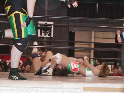 コマンドコルバタからアンクルホールド、日向は下から蹴り上げてブレーク。コマンド飛びついてミステリオ・ラナ(左写真)、カウント2。もう一度肩車の体勢になるとライムライト、これも2。