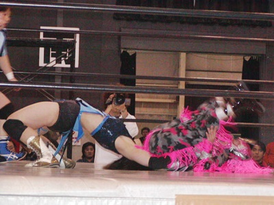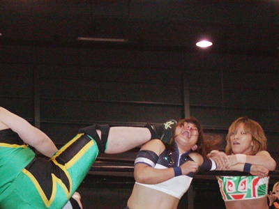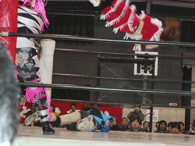 コマンドとASARIが先制攻撃。しかしすぐに日向が反撃して場外乱闘に(右写真)。コマンドは日向を本部席のニラにぶつける(右写真)。ASARIは渡辺を客席に。