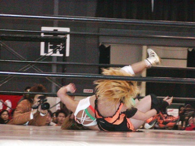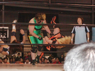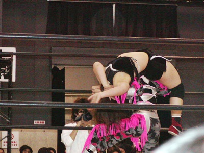 ASARIロープに振る、日向切り返してジャーマン(右写真)、カウント2。日向コーナーに上る、コマンドが足を押さえてASARIが雪崩式フランケンシュタイナー、カウント2。ASARIはコマンドにタッチ。