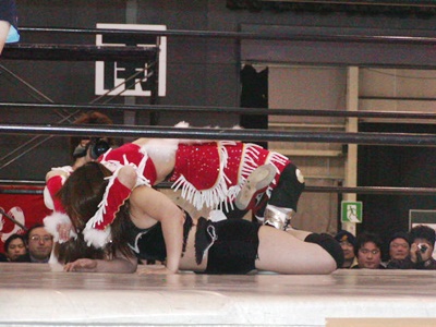 春山ロープに振る、矢樹パンチを側転でかわす、春山ソバットからカバー、矢樹ブリッジで起きて十字に(右写真)、春山持ち上げてマットに叩きつける。
