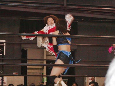 コマンドと日向がリングに戻る、コマンドはロープ渡り(左写真)からホイップ、キック入れてASARIにタッチ。