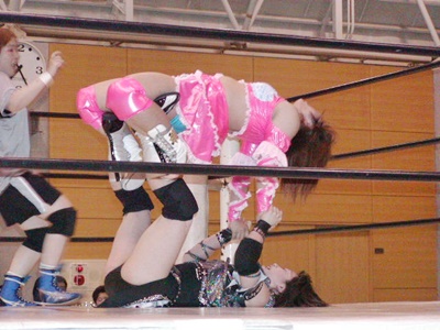 日向ジャーマン、カウント2。日向コーナーに上って延髄ニー、今度は完璧に決まってカウント3。