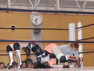 米山ストンピング、首投げから首4の字。日向はレッグロックに切り返す。さらに吊り天井に(右写真)。日向リリースして腰にパンチ、コマンドにタッチ。