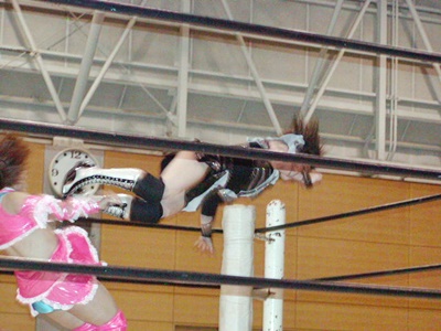 米山ミサイルキックからダブルリストアームサルト、日向ブロックしてヒザ蹴り。日向パンチ、米山かわしてダブルリストアームサルと(左写真)、カウント2。米山コーナーに上ってムーンサルトプレス、日向足出してブロック。これは痛そう。
