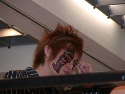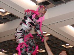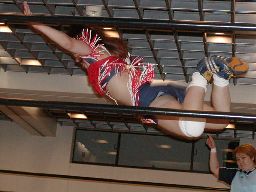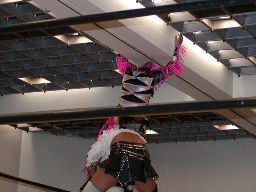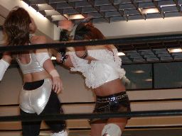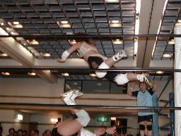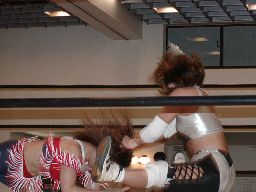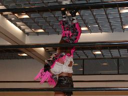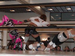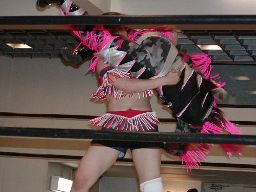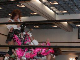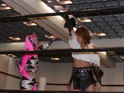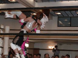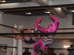 三田ロープに振る、コマンドパンチをかわして張り手、矢樹を呼び込む。ダブルのブレーンバスター狙うが三田はブロックして2人まとめてスタナー。三田コマンドを肩車に、コマンド必死にブロック。三田セカンドコーナーに上ってコマンドを肩車に、コマンド天井につかまって逃げる(右写真)。コマンドクロスボディ、三田キャッチして叩きつける。坂井にタッチ。
