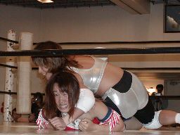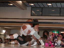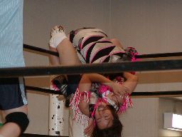 コマンドと矢樹ダブルのバックドロップ(右写真)、矢樹がカバー、カウント2。矢樹バック取る、三田ブロック。コマンド入ってダブルで引き倒す。