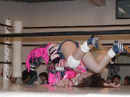 三田は坂井にタッチ、坂井悪びれずj「私に任せてください」。手四つからコマンドキック、矢樹入ってダブルでロープに振る、坂井クローズラインをかわして2人にドロップキック、しかしキャッチされる。三田が入る。コマンドは三田を捕らえると坂井のたたんだ足に三田の足をねじ入れる。リバースデスロック風になったところで三田の両手を持って扇(右写真)。コマンドは矢樹にタッチ。