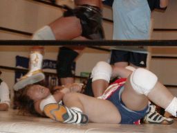 コマンドは変形のタランチュラ、矢樹もエプロンから踏みつける(左写真)。コマンドストンピング、ブレーンバスター狙うが坂井は首固めに切り返す、カウント2。坂井ストンピング、バック取ると片羽絞め、三田にタッチ。5分経過。
