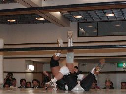 先発はコマンドと三田。三田が手を上げるとコマンドは届かない(右写真)。矢樹が入ってコマンドを肩車。コマンドの方が高くなる。