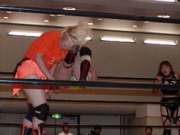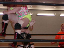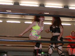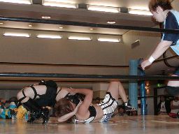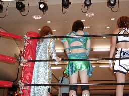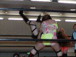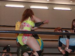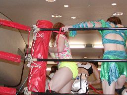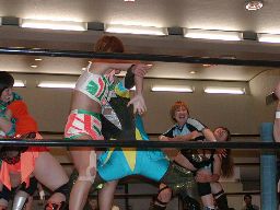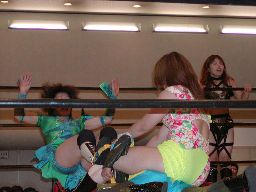 木村ロープに振る、渡辺切り返してえりりんロック(右写真)、宮崎がカット。渡辺ロープに振る、木村フライングクロスアタックで返し宮崎にタッチ。