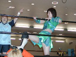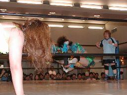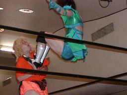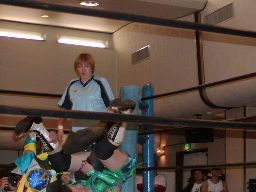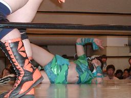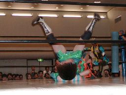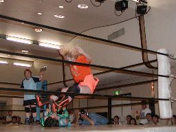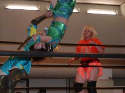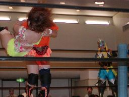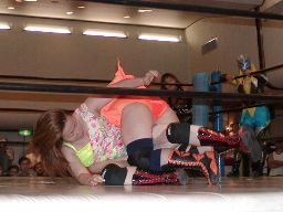 木村ドロップキック、ロープに振る、渡辺ショルダーブロックで返す。渡辺引き起こす、木村首固めに、カウント2。渡辺変形のリンギーナ(右写真)、宮崎がカット。