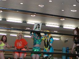6人がプラム麻里子の入場テーマ「Don't Cry ANGEL」で一斉に入場。なぜか宮崎が日向のガウンを着て入場してきた(右写真)。