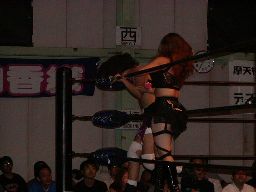 渡辺ロックアップせずにいきなり松尾に張り手、ターンバックルにぶつけて(左写真)ヘアホイップ。