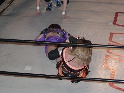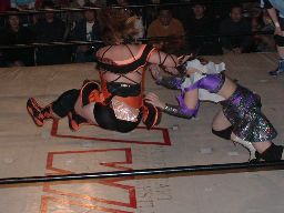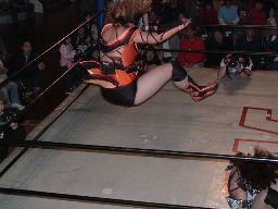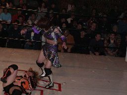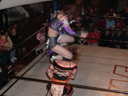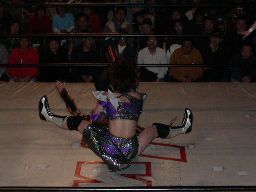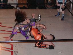 春山オレンジ☆ブロッサム(右写真)、これも2。春山カナディアンバックブリーカー、日向着地。日向ロープに飛ぶ、春山カウンターのトラースキック。春山ロープに飛ぶ、日向トラースキックのお返し。しかし春山はラリアット。