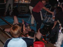 春山は日向を客席、ステージの端に投げつける。さらにステージ上でブレーンバスター(右写真)、コーナーに上ってステージ上の日向にダイビングフットスタンプ。リングに戻してダブルアームフェースバスター狙う、日向ブロック。春山ソバット入れてダブルアームフェースバスター、カウント2。