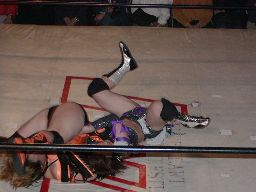 春山ローリングクレイドル狙う、日向ブロック。春山バック取ってジャーマンで投げローリングクレイドル(右写真)、カウント2。10分経過。