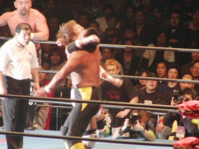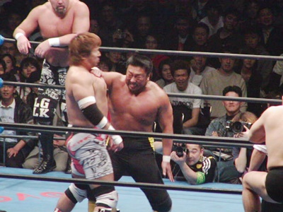 川田が小島に張り手、逆水平(左写真)。小島も逆水平打ち返す。張り手打ち合い、小島ヘッドロック。川田ロープに振る、小島ショルダーブロックで吹っ飛ばしブレーンバスター、川田すぐに立ち上がって顔面キック。小島は武藤にタッチ。5分経過。