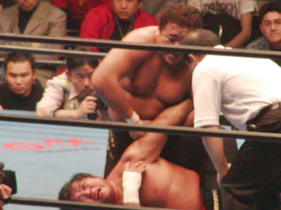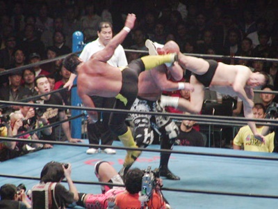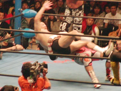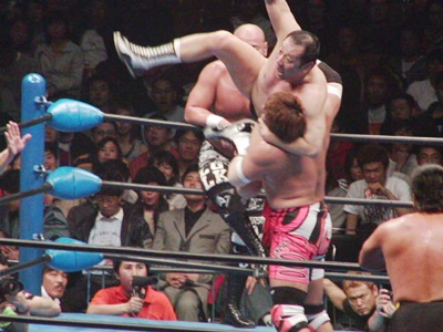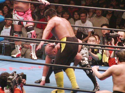 小島は川田にラリアット(右写真)、武藤が川田を場外に蹴り出す。