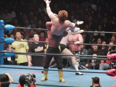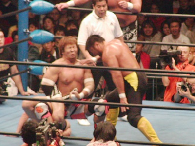 武藤サソリ固めの体勢からリバースデスロック(右写真)、渕ロープ。武藤STF、渕ロープ。武藤は小島にタッチ。